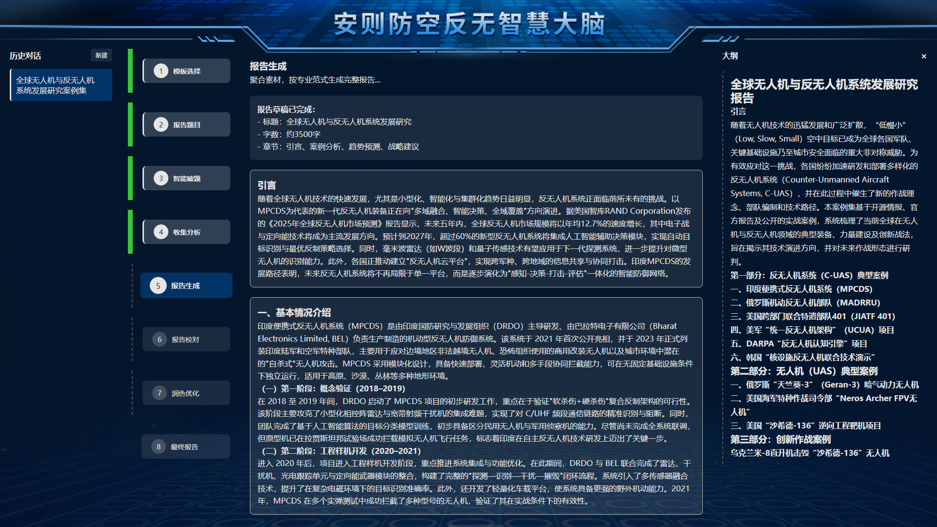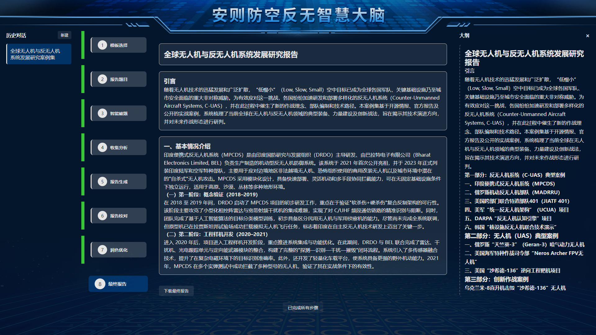 无论是国防全域防控的战略规划、低空安保的方案设计、标准体系建设,还是技术研发的趋势研判、训练机构的成效解析;无论是日常管理的调度方案、边境防控的动态评估、敏感区域的监管策略,还是应急响应的处置建议、长期体系的建设规划……一体机都能精准匹配对应模板,快速整合数据、梳理逻辑、形成结论。